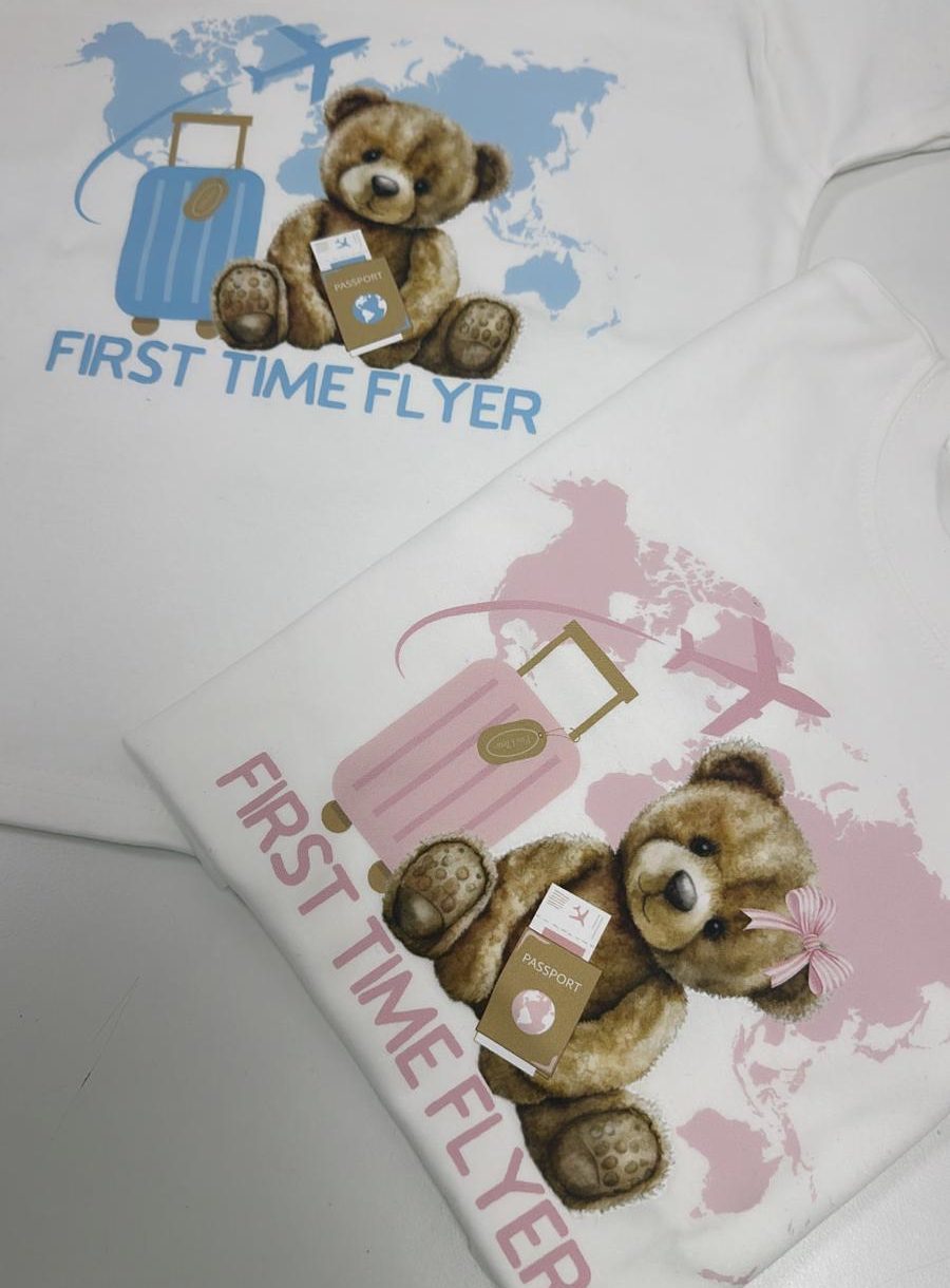 Make your little one’s first adventure extra special with our adorable “First Time Flyer” T-shirt. Featuring a cute teddy bear ready for take-off with its suitcase and a soft world map backdrop, this design captures the excitement of a child’s very first journey.