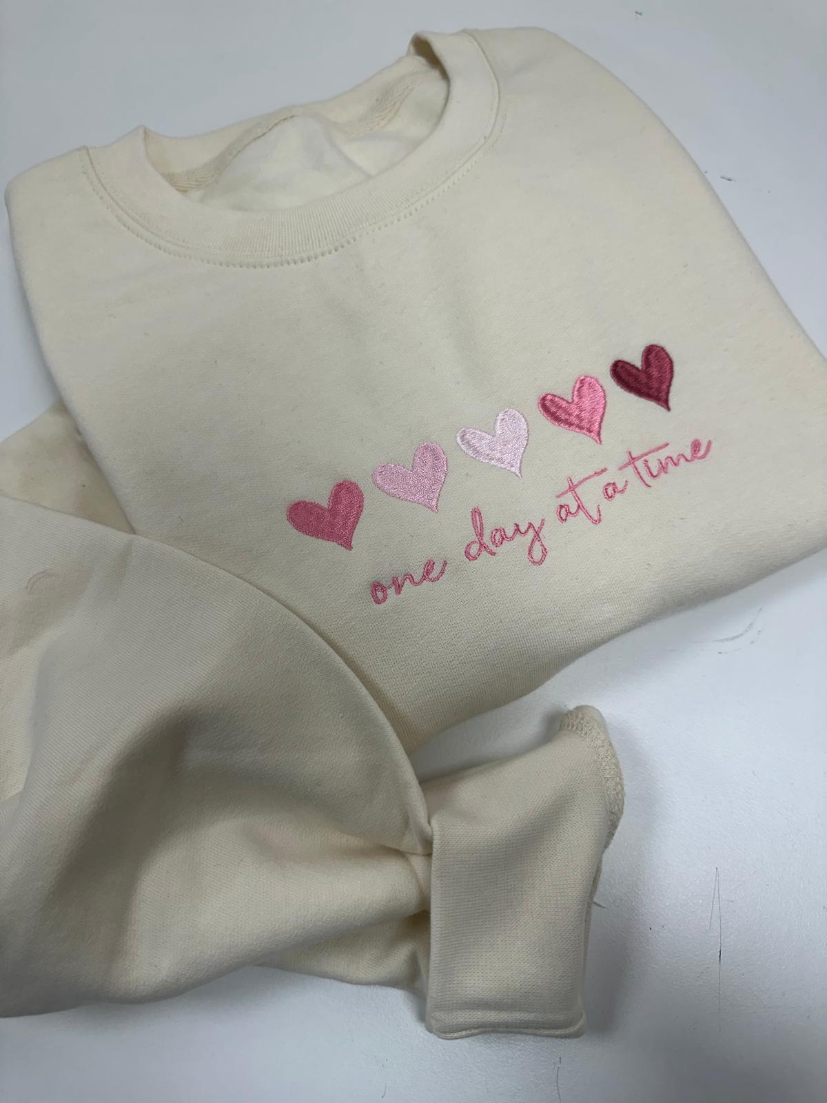 Keep things simple with our “One Day At A Time” embroidered sweater, featuring a clean, minimalist design stitched directly into the fabric. This timeless piece is perfect for everyday wear, offering both comfort and a gentle reminder to take life one step at a time.