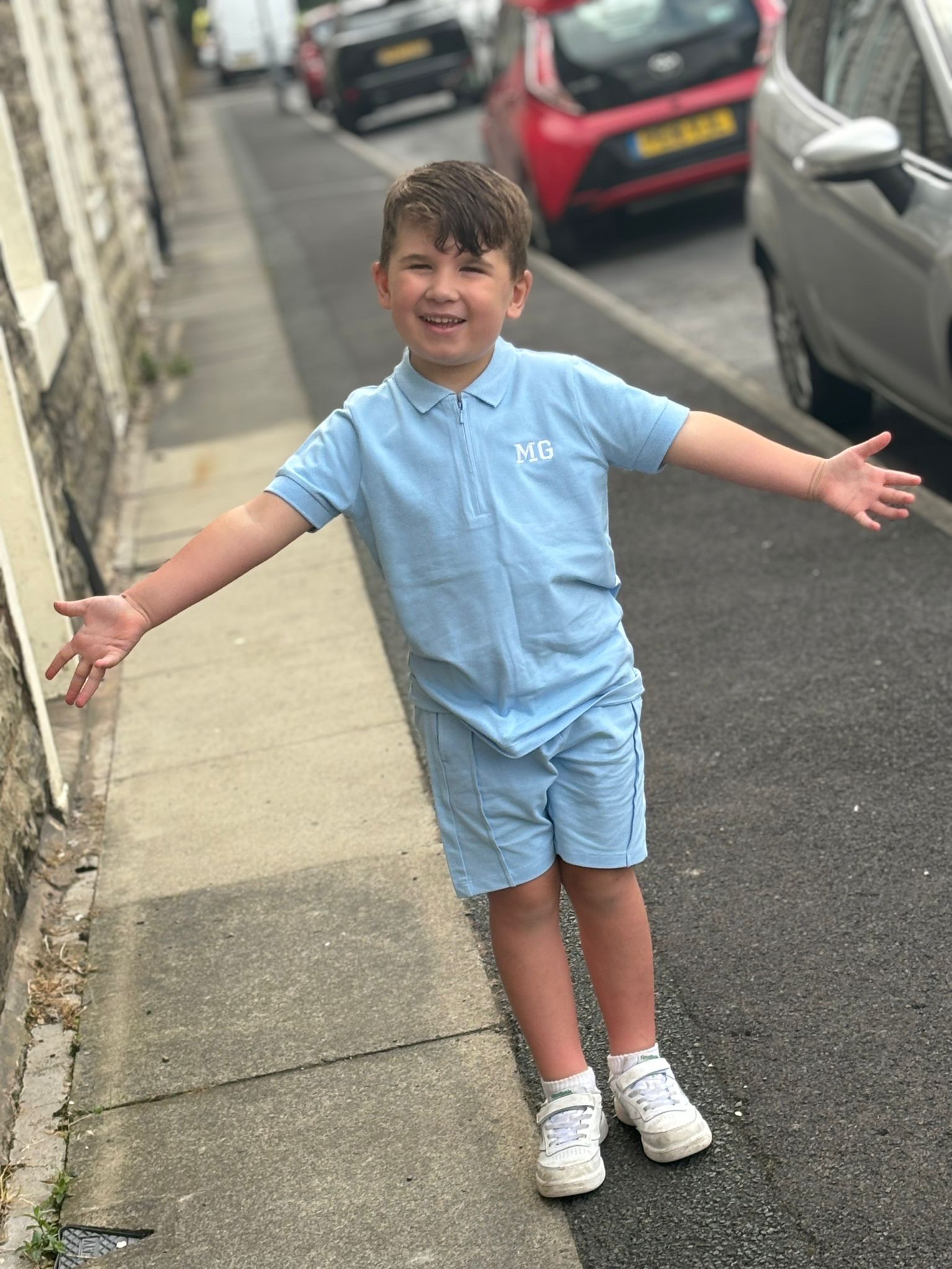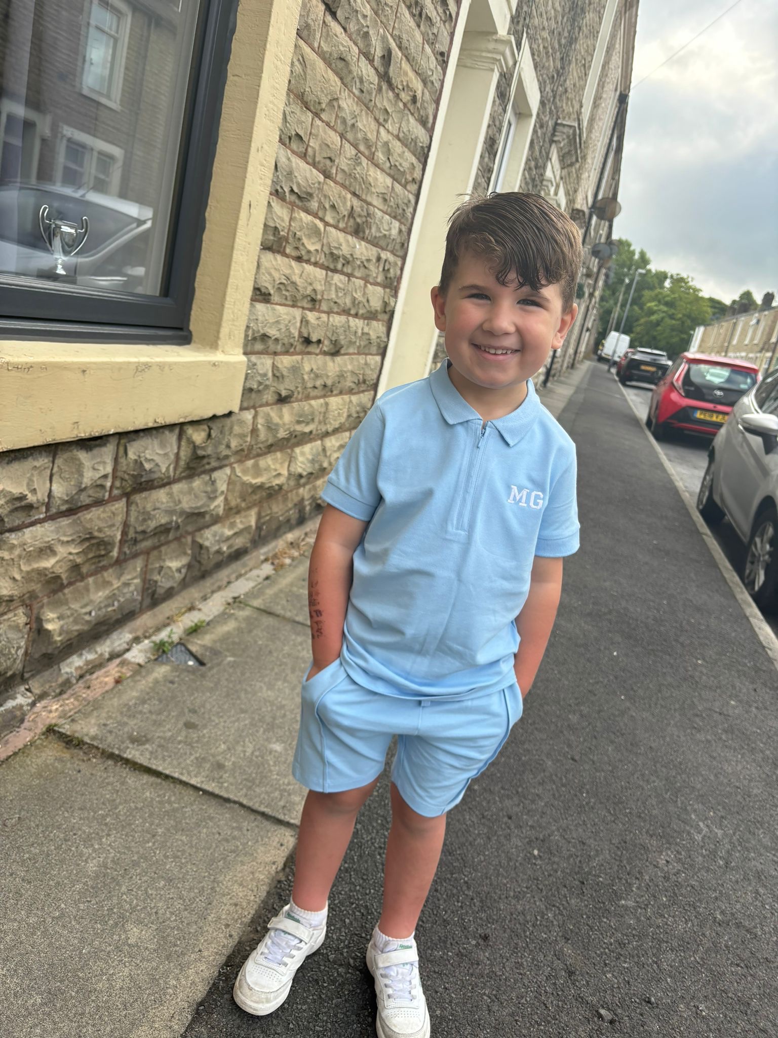 These beautiful sets come with a simple name or initial design. Embroidered on the left chest